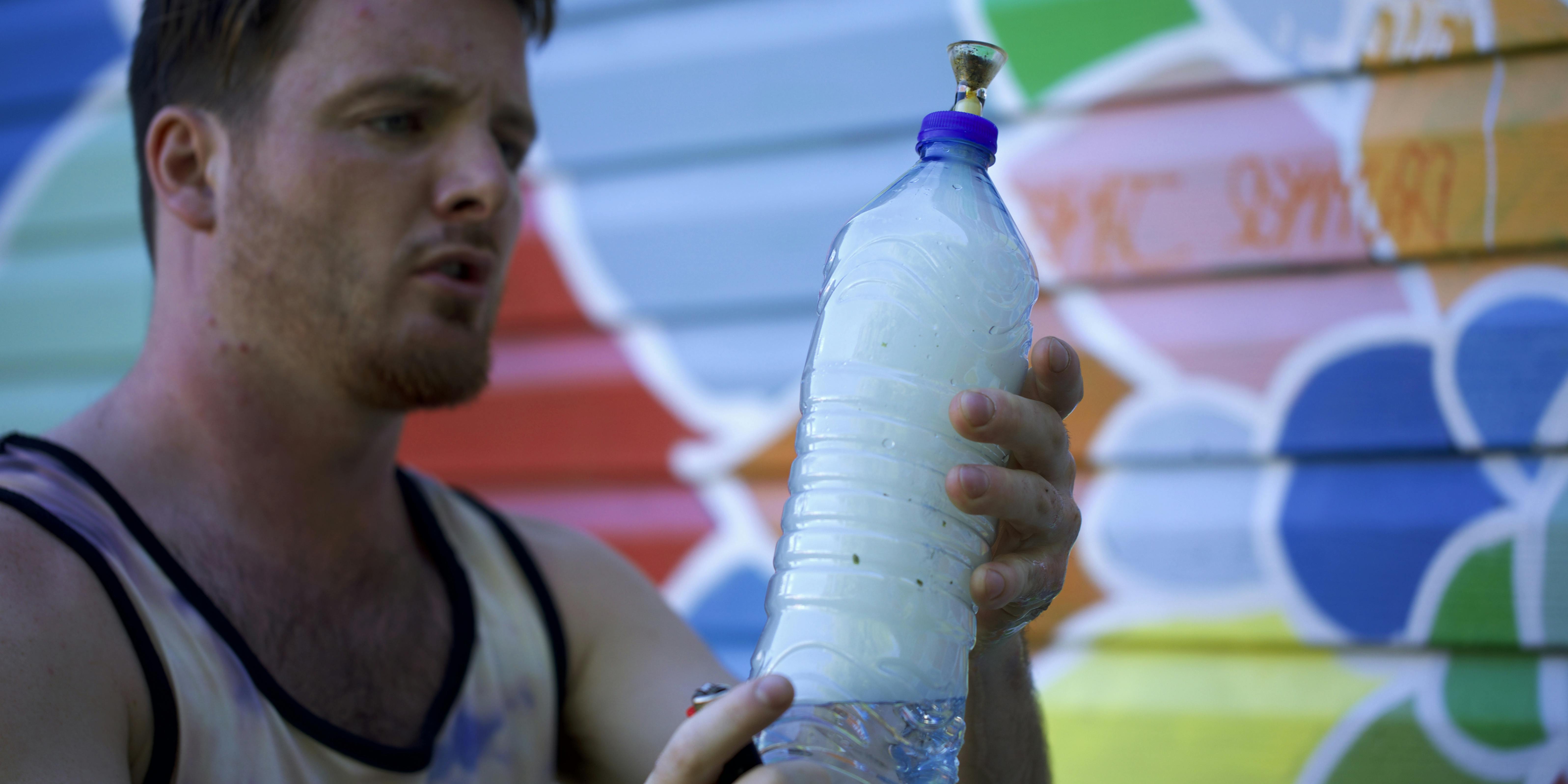 When the foil is taut over the opening of the bottle, use a toothpick, pencil, or the tip of a knife to poke a few small holes into the tin foil. When you’re ready, place your ground flower atop the tinfoil bowl and heat with a lighter. Smoke should travel through the holes in the tinfoil and fill the cavity of your new waterfall pipe.