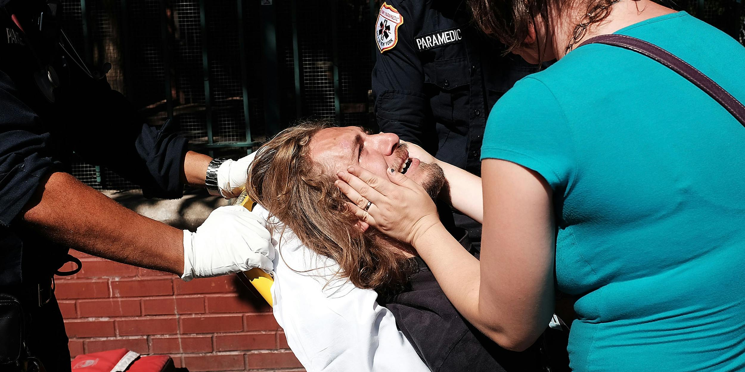 NEW YORK, NY – AUGUST 28: A man is consoled as paramedics take him to the hospital for what is thought to be an overdose of K2 or ‘Spice’, a synthetic marijuana drug, along a street in East Harlem on August 28, 2015 in New York City. New York, along with other cities, is experiencing a deadly epidemic of synthetic marijuana usage including varieties known as K2 or ‘Spice’ which can cause extreme reactions in some users. According to New York’s health department, more than 120 people visited an emergency room in the city in just one week in April. While the state banned the ingredients used to make K2 in 2012, distributors have switched to other ingredients and names in an attempt to circumvent the law. (Photo by Spencer Platt/Getty Images)