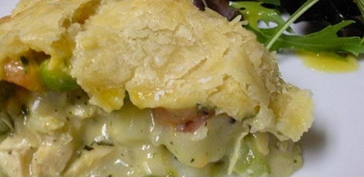 Line pie dish with 1 sheet of thawed pie crust. Spoon chicken filling into the lined pie dish.
