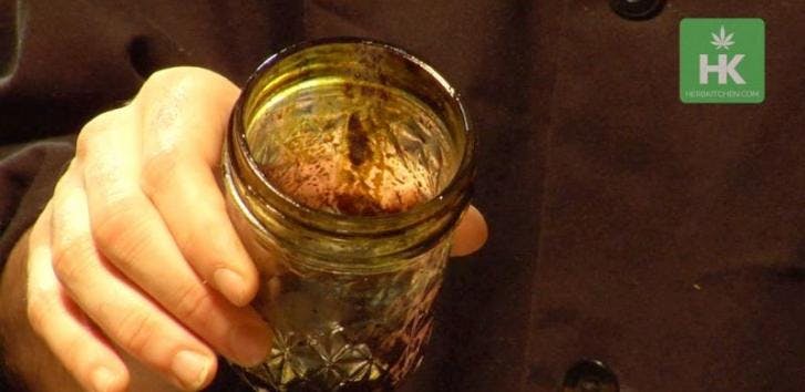 Decarboxylate the cannabis by heating the jar in a large pot of water, until there are a few bubbles and movement in the jar